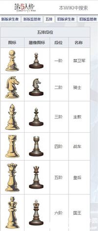监管者和求生者的五排段位顺序分别为一阶、二阶、三阶、四阶、五阶、六阶,名称分别是:禁卫军、骑士、主教、战车、皇后、国王。