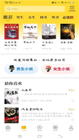1、进入app,能够选择自己的阅读偏好,并会为用户推荐高评分的图书内容