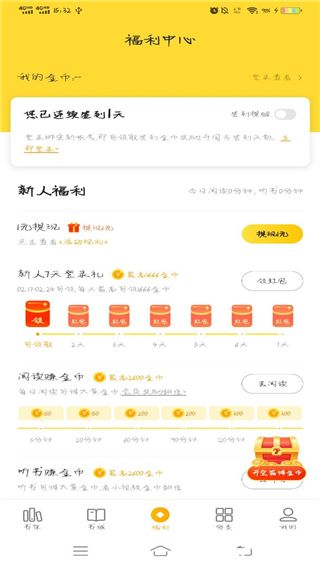3、在福利中心可以进行签到领取金币,还可以通过阅读,听书等活动赚取金币,金币积攒到一定的数量是能够按照一定的比例获取收益