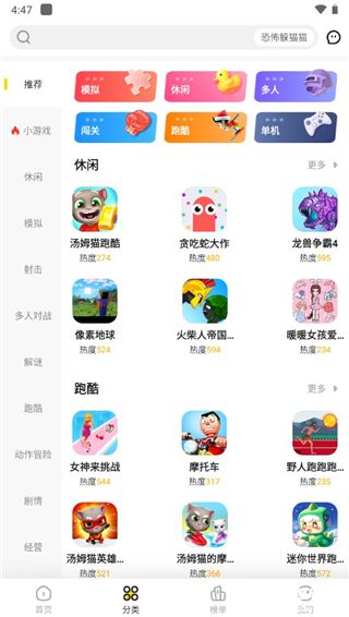 3、在分类界面中,对软件中所有的游戏都进行了类型分区,如休闲,模拟,射击,多人对战等,不管你喜欢什么类型的游戏,这里都可以找到