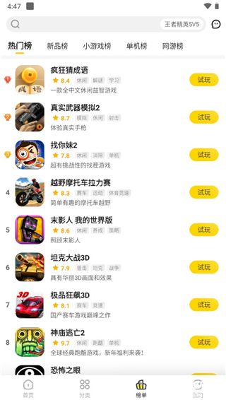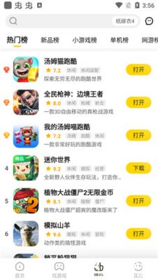 4、点击榜单进入排行榜,这里对一些热门的游戏进行了排行,排名是由游戏的热度决定,并根据游戏的类型分成了不同的榜单,热门榜,新品榜,小游戏榜等,能够为玩家带来受欢迎的好游戏。