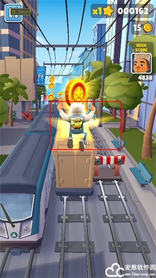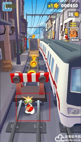 滑板 ,通过双击屏幕来启动滑板,滑板会持续一段时间。在没有滑板的情况下,角色撞到火车或者障碍等都会被抓住,游戏终结。但在有滑板的状态下,角色就有了一道保险,撞到火车等的时候,滑板会消失,游戏可以继续进行。