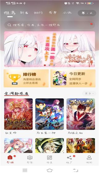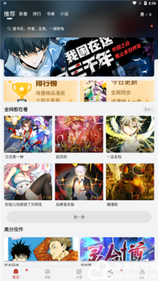 1、进入主界面,书城中有许多热门的漫画推荐,并根据漫画的出版时间,热度等分成了不同的版块,并根据男女的不同爱好做出了分类,点击右上角的男女可以切换成男生女生模式,同时软件中还有丰富的小说资源,用户可以在这里尽情的阅读