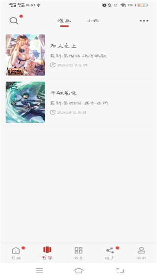 3、书架功能,类似于关注列表,能够看到自己加入书架的漫画和小说,以便观察该作品的最新状态