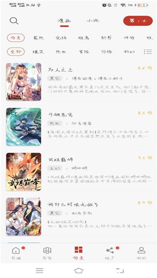 4、分类功能将所有的漫画和小说根据作品的热度,是否完结,类型做出了不同的名单,用户可以在这里找到自己喜欢类型的漫画或者是小说