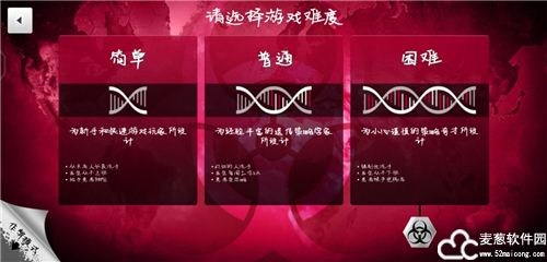 5、选择游戏的难度,有简单,普通和困难三种,难度越高,瘟疫的传播也就越困难,也更具挑战性,随后可以修饰瘟疫的遗传密码,让病原体更容易隐藏起来