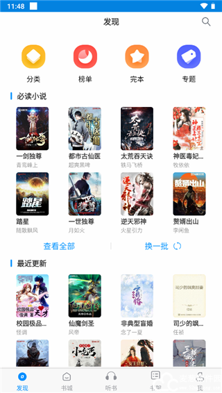 1、进入软件界面,发现功能会自动为用户推荐热门小说,顶部为用户提供了四个功能,分类,将所有的小说资源根据其类型进行了细致的划分,榜单,以热搜,新书,完结等进行排名得出的排行榜,完本,提供以完本的小说,专题,根据小说的版块为玩家推荐相关的小说