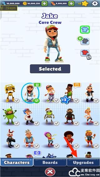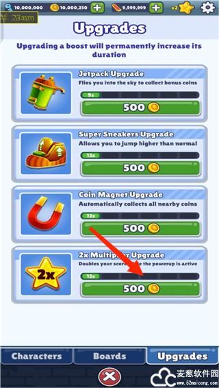 2、点击ME,点击右下角的Upgrades,通过升级双倍得分来提升倍率,在跑酷的过程中见到双倍得分也可以战士提升倍率