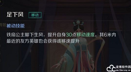 被动技能:足下风 铁扇公主移动速度比自身基础移动速度高30点,也可以提高附近6米范围内最近友方英雄森林的30点移动速度,具体局内提现为,铁扇公主所行之处有绿色的痕迹,与被提升移速的英雄形成绿色的链接。(ps:飞天舞姬是粉色的,超级好看,视觉盛宴!)