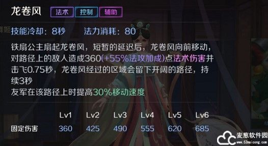 一技能:龙卷风 铁扇公主用芭蕉扇朝指定方向卷起一道龙卷风,龙卷风向前移动有短暂延迟,龙卷风对路径上的敌人造成法术伤害并造成击飞,击飞效果持续0.75s,龙卷风经过会留下路径,友军在该路径上会提升自身30%移动速度,路径持续时间3s。
