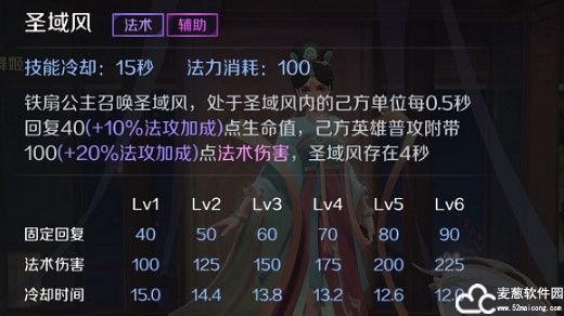 二技能:圣域风 铁扇公主原地召唤一个圆形的区域圣域风,处在圣域风内可以为友军回复部分生命值,并且处在圣域风内的友军普攻附带额外法术伤害,圣域风存在时间持续4s,回复生命值和普攻附带法术伤害与铁扇公主自身法术攻击正相关。