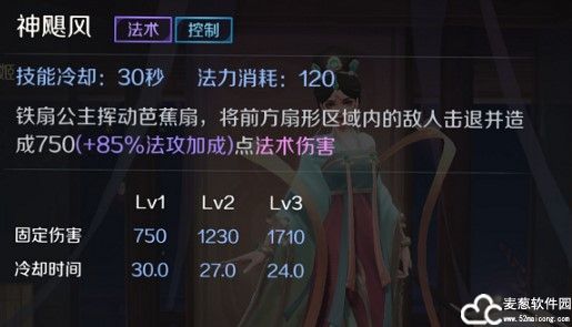 三技能:神飓风 铁扇公主挥动芭蕉扇向指定方向制造一个扇型的区域,对区域内的敌人造成法术伤害并造成击退效果。