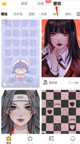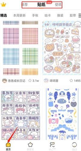 1、这是软件界面,最上面有三个功能,推荐、贴纸和壁纸,更方便的找到需要的图片;