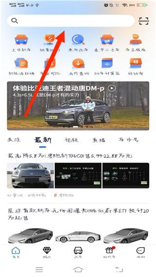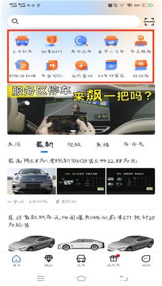 1、进入软件主界面,页面顶部为用户带来了众多功能,上市新车,销量排行,条件选车等,能够满足用户绝大部分的要求,并且还会为用户推荐最新的车市消息