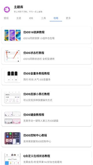 美化软件,包括iOS系统,还为用户提供了大量热门的主题壁纸以及iOS的大量组建功能,同时该软件支持各种安卓机型,如小米,oppo,vivo等,都能够直接使用,非常的便捷。在主题库中,这里所有的内容全部都是免费的,并且没有任何的广告弹窗或者是需要完成各种任务,只需要一键设置就能够轻松完成主题美化,此外,软件中的功能也非常的多,为用户带来了iOS系统的音量键,桌面效果等控件功能,并且针对不会使用本软件的用户专门设置了单独的攻略版块,这里几乎列出了在设置过程中所有可能会出现的问题,如果碰到没有的,也可以反馈克服进行解答。