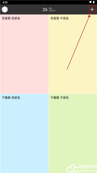 2、在主界面用四种不同的颜色划分区域,红色代表很重要很紧急的事件,黄色代表很重要不紧急的事件,蓝色色代表不重要很紧急的事件,绿色代表不重要不紧急的事件,点击右上角的加号能够设置事件