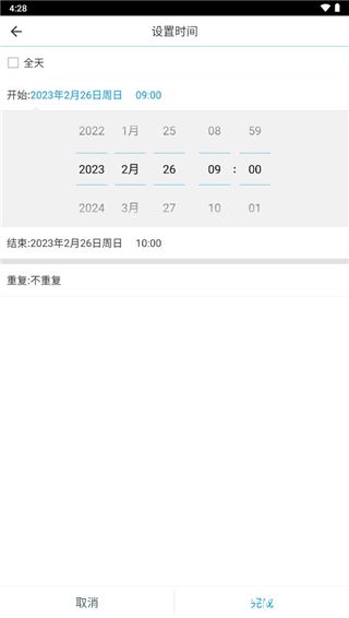 4、点击时间进入时间设置界面,选择事件的开始时间和结束时间,设置完成之后点击右下角的完成