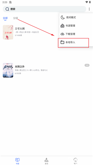 1、点击软件图标进入主界面,点击右上角的三个点,在弹出来的选项框中选择本地导入
