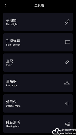 3、点击右下角的工具箱,这里为用户带来了多种生活中常用的工具,如手电筒,直尺,量角器等