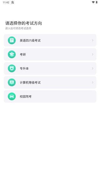 1、点击软件图标,在进入主界面之前需要选择你的考试方向,进入之后可以修改,这里为用户提供了英语四六级,考研,专升本,计算机等级考试和校园驾考