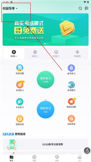 2、这里小编选择的是校园驾考,进入主界面后,点击左上角能够更改考试方向