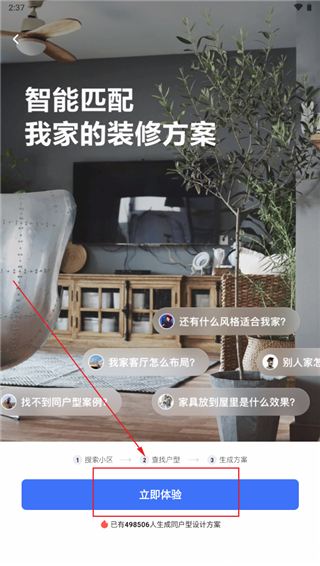 2、点击立即体验,随后将自己家所在的小区名称输入在搜索栏中,这里能够帮助你快速找到相同户型的房子