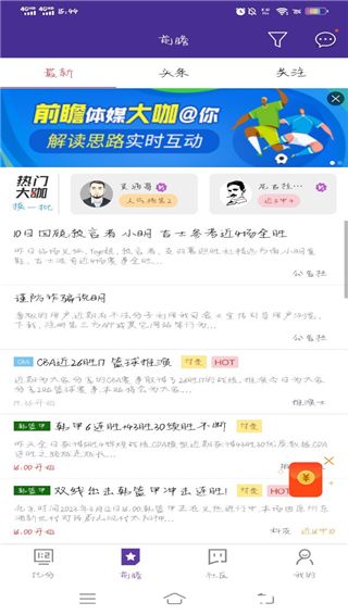1、首先进软件的主界面,这里为用户带来了最新最热的资讯信息,让用户能够更好的了解到比赛的情况以及各种相关的资讯