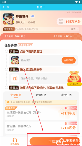 2、任务中都是一些游戏,点击一个自己喜欢的游戏,随后点击下载游戏