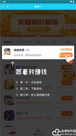 1、首先点击首页上的“我要赚积分”,这里为玩家提供了三个任务渠道,随意点击一个任务进入