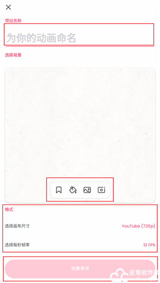 2、在项目名称中输入文件的名称,选择背景中为用户带来了四种选项,依次分别是场景,调色板,图片和拍照,选择好背景之后在格式中选择好文件的格式,随后点击创建项目