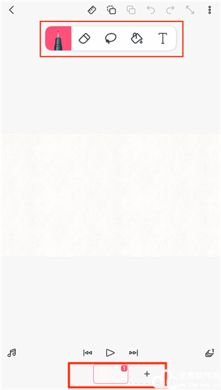 3、进入到创作界面,这里为用户提供了丰富多样的工具帮助用户进行创造,界面正下方被圈中的是每一帧的内容,点击+能够增加帧数