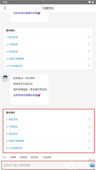 3、在咨询页面中,有猜你想问栏,这里都是最常见的问题,如果在这里没找到自己想问的就可以通过界面底部的输入栏进行打字询问