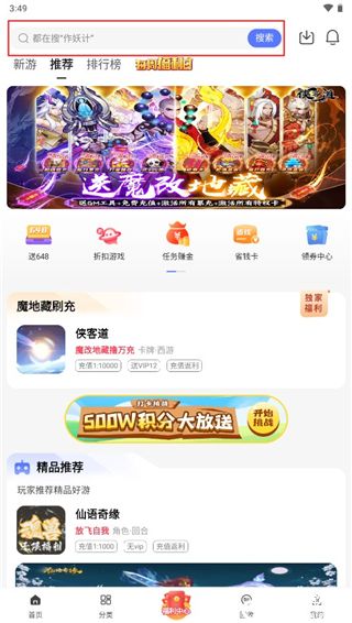 1、进入软件主界面,这里为用户带来了许多精品游戏和各种福利,如送648,折扣游戏等,还可以在上方的搜索栏中搜索自己想玩的游戏,只需要输入关键字就会自动推送相关内容