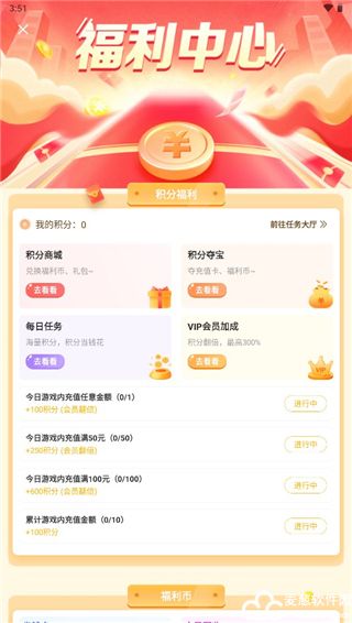3、进入福利中心,用户可以在这里领取各种人物,完成之后会有积分奖励,积分可以兑换各种游戏福利