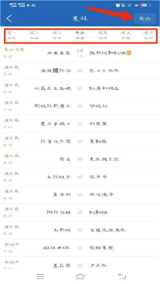 2、在赛程界面中,为玩家带来了近期所有的赛事,通过上方的时间能查看过去以完成的比赛或者是即将开始的比赛,点击右上角的筛选进入筛选界面