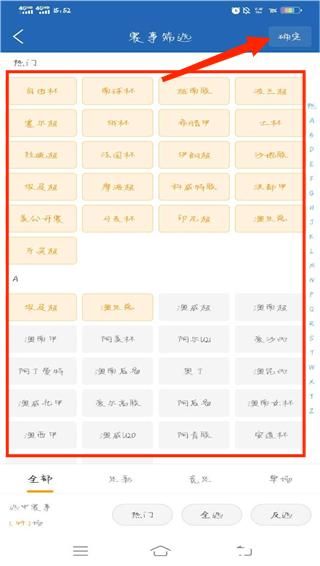 3、这里为大家展示的是各种比赛如自由杯,南球杯等,还有着各个国家的球队,用户可以通过选中对应的赛事或者是地区来寻找自己想看的比赛,选择好之后点击右上角的确定即可