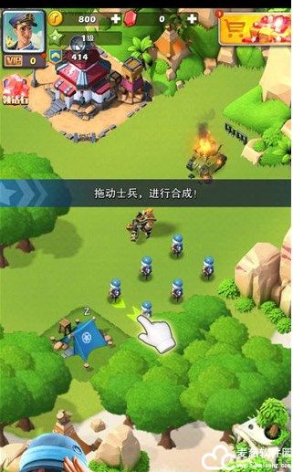 2、开始的时候会有简单教程,比如这里的拖动士兵合成,合成玩法是游戏一大亮点;