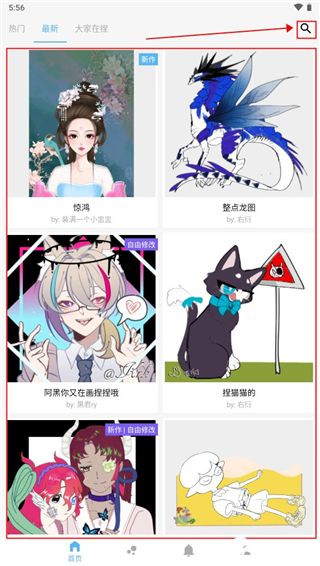 2、点击界面右上角的搜索进入搜索界面,用户可以通过输入关键词来寻找自己感兴趣的作品