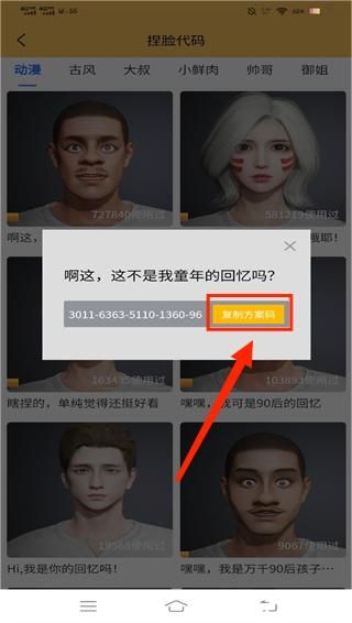 3、点击一个自己喜欢的脸型,系统会弹出相关的代码,点击复制代码,兑换进入和平精英修改即可
