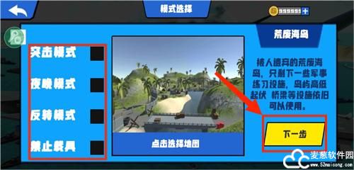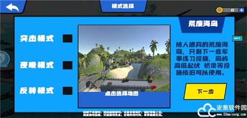 2、在模式选择界面中选择要体验的模式,点击地图可以更换地图,设置好之后点击下一步