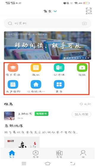 1、进入软件的主界面,这里为用户带来了大量的功能,如学术资源,报纸,公开课等,涵盖了社会的各方各面,还会推荐各种各样的经典图书