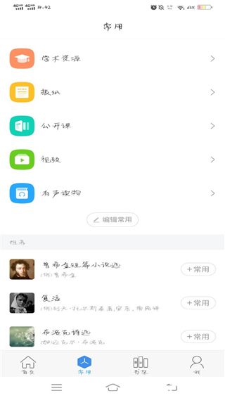 2、在常用界面中都是一些用户经常使用的功能,当然也会推荐一些著名人物写的作品