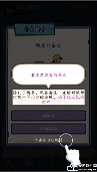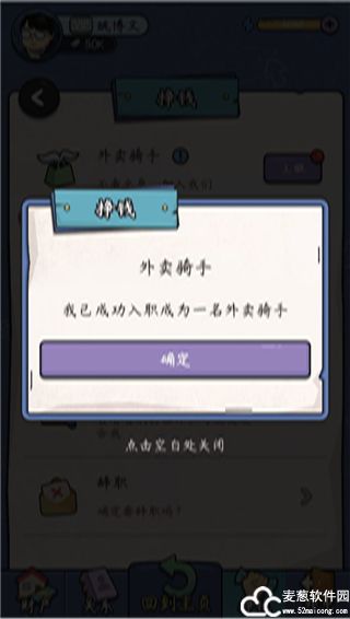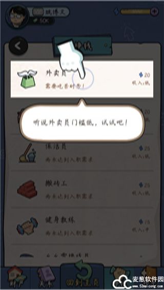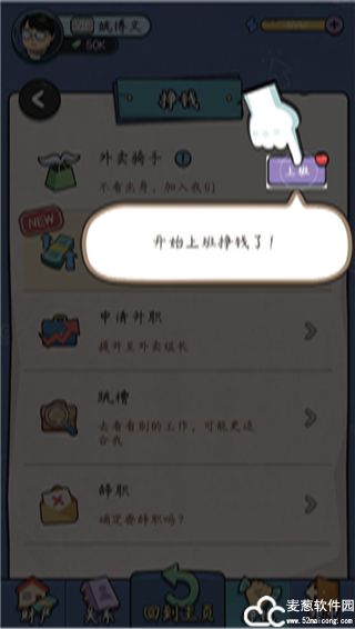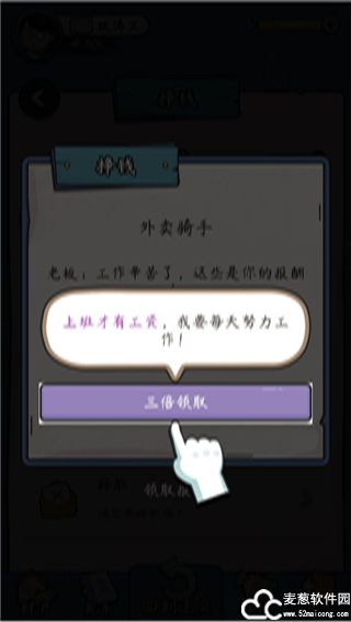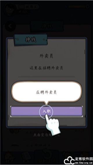 1、进入游戏,在这里你将会扮演一名失业的中年人,你需要外出工作赚钱养家,跟着提示去应聘外卖员