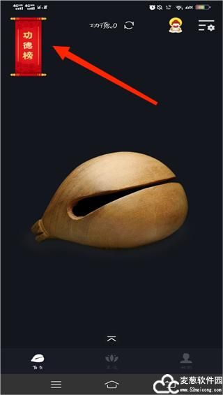 1、首先进入软件的主界面,在界面中间有一个木鱼,每一次敲击木鱼可以获得一点功能。点击左上角的排行榜