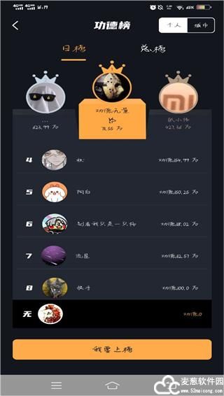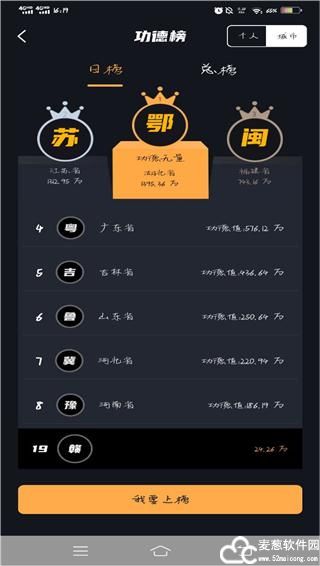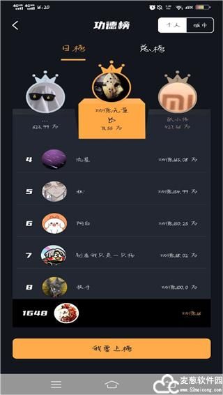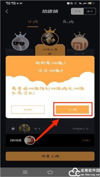 3、如果想要进入榜单,首先需要拥有功德,最少为一,在排行榜页面中点击我要上榜,然后在弹窗中点击上榜,这时就可以看到你的排名了