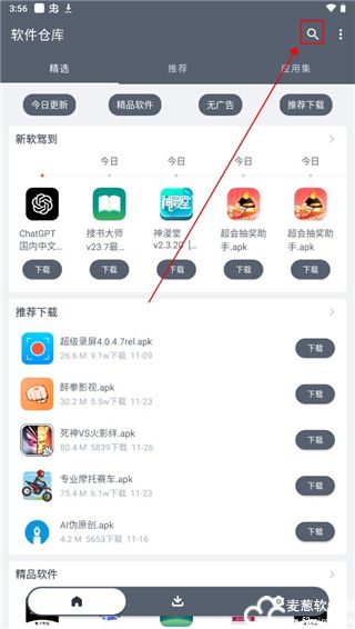 1、进入软件的主界面,这里为用户带来了大量的精品软件和游戏,点击右上角的放大镜可以进入搜索页面