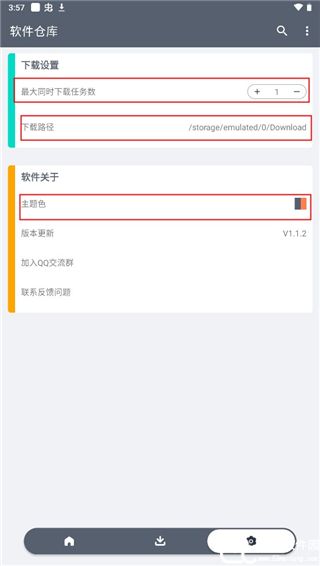 4、在设置界面中,你可以在这里设置最大同时下载数量,下载路径和主题颜色,值得一提的是,最大同时下载数量的上限很高,小编试过找到最大的下载数量,但是一直加到了四百多还可以往上加