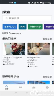 Coursera官方版是一款拥有海量学习资源的在线学习教育平台,软件中的学习资源科视频课程全部是来自于全世界顶尖的大学,里面的内容非常丰富,用户可以在这里找到任何自己想要的内容,如果你是为了考证而来,那么只要选择自己要考证的方向,就可以在这里进行相关的学习,并且系统会自动为用户制定好学习计划,用户只需要按照流程学习即可,学习完成之后还会有专业的练习帮你巩固知识点,让你可以更好的进行学习。在Coursera中,覆盖了二十五个专业的领域和近千门公开课程,从计算机到法律,数学到音乐,可以说是覆盖了我们生活中的方方面面。除此之外,该软件还支持课程离线缓存,只要提前下载缓存,那么你就可以在任何时间,任何地点进行学习,非常的实用方便。