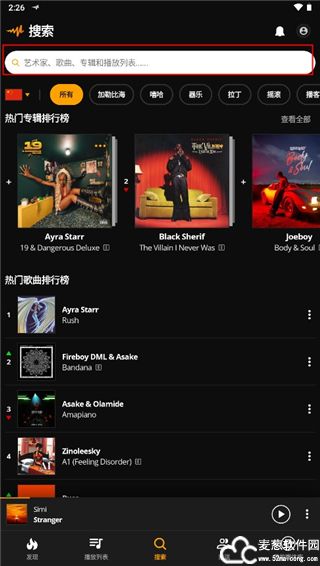 3、在搜索页面汇总,只需要输入艺术家,歌曲,专辑,播放列表等关键词就可以快速找到对应内容