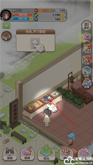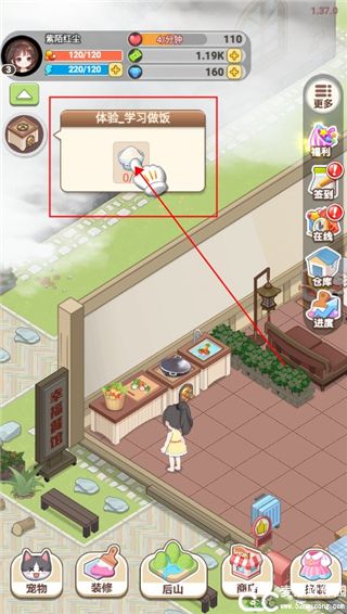 1、首先先点击左上方的学习做饭,随后根据提示点击灶台